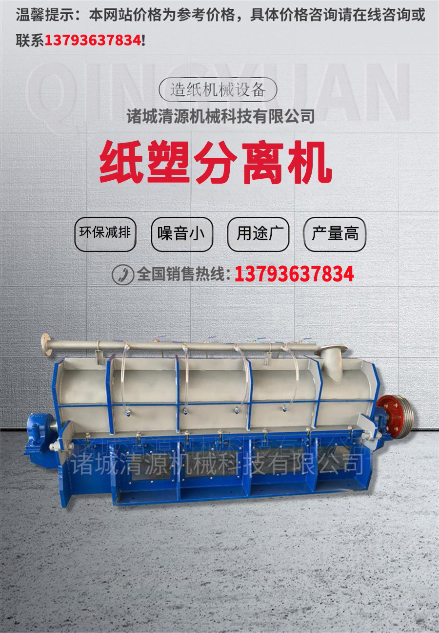 諸城清源機械生產的紙塑分離機包括一焊接的組裝主體,主體支撐著篩板、轉子、收集槽、渣滓排放槽和支架,它是水平安裝的。